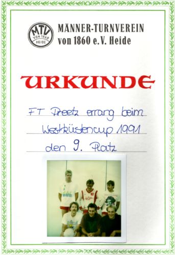 (8) 4. Platz Punkte: 14:18 Sätze: 30:32 Klassenerhalt Neu zur Mannschaft stießen: Uli Brandenburg (?), Sven Carstensen (?) Trainer: Kirsten Möller Mi 1991 (?) Trainer: Michael Koch Do Dierk Tiessen Do |