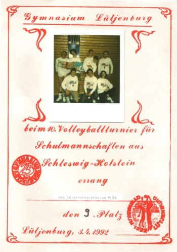 Punktspielrunde 1991/92 Mannschaft Herren II Kreisliga Kiel (9) 2. Platz Punkte: 20:4 Sätze: 31:10 Aufstieg: Bezirksklasse Trainer: Michael Koch 1991 |